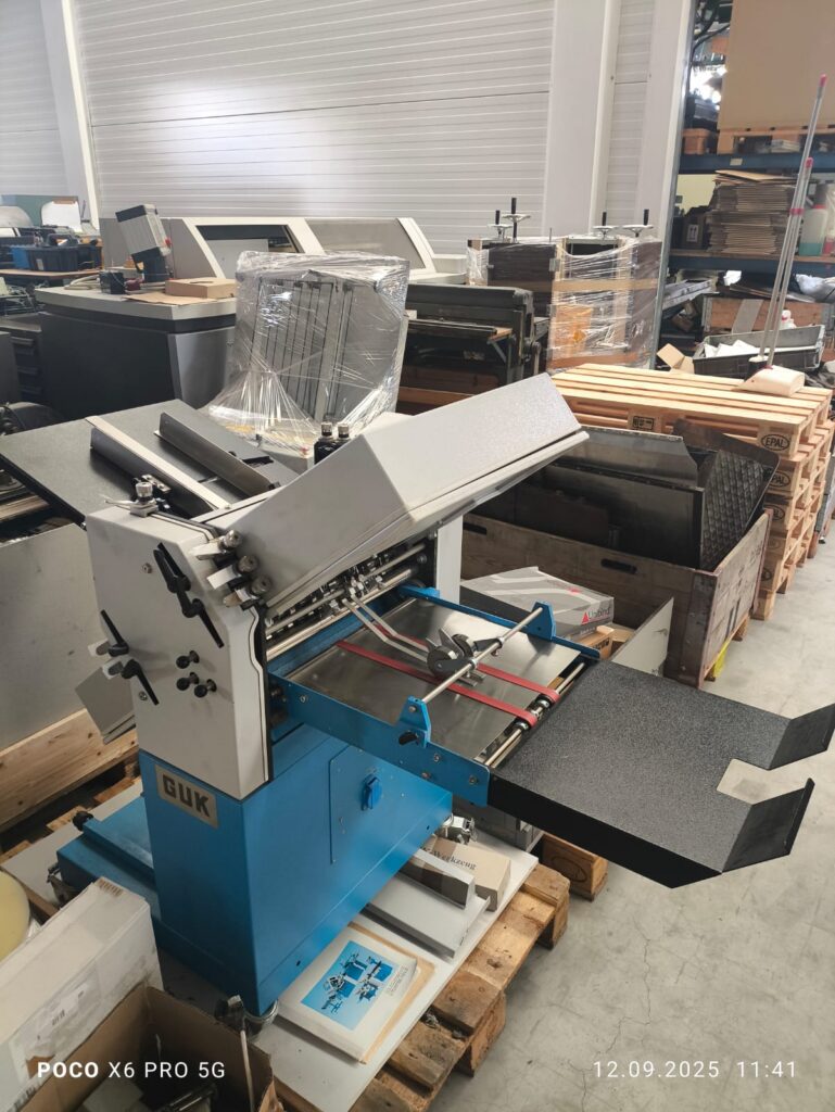 Falzmaschine GUK FA 36/4 AS, Maschinennummer 49664, Baujahr 2005, 4 Taschen, Geschwindigkeitsregler, Friktionsanleger, Lärmdämmabdeckung, Zähler, Auslage, in einem guten Zustand,…
