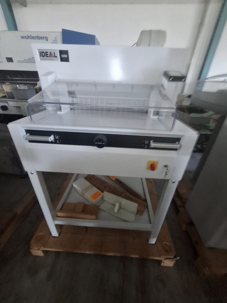 Schneidemaschine Ideal 5255 Guillotine, Maschinennummer 3378431, Baujahr 2014, Sicherheitshaube, Programmsteuerung, digital Anzeige, in einem guten Zustand, sofort Verfügbar Bei Interesse…